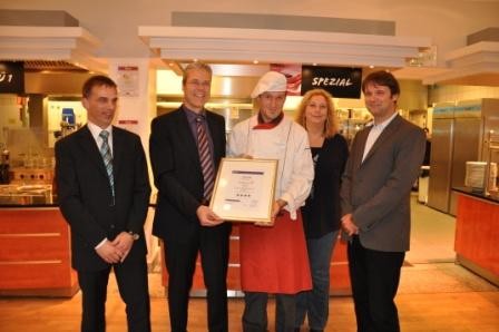 11/2010 (Quelle: interne Kommunikation): Bereits zum zweiten Mal wurde das Evaluierungssystem "GV-Star" in den gastronomischen Einrichtungen der Stadtwerke Frankfurt durchgeführt. Hierbei erhielten die Betriebsstätten die bisherige Höchstbewertung von vier "GV-Stars". Sowohl der Betriebsleiter von EUREST als auch der zuständige Geschäftsbereich der Stadtwerke (Personal, Recht und Zentraler Service) haben enorme Anstrengungen unternommen um das vormalige Prüfergebnis von drei "GV-Stars" zu verbessern. Der Geschäftsbereichsleiter, Hr. Dr. Kreuzer sprach den Mitarbeitern und den für diesen Bereich verantwortlichen Führungskräften von EUREST seine Anerkennung für dieses bemerkenswerte Engagement aus. Am 30.11.2010 erfolgte die Übergabe der GV-Star-Urkunde.